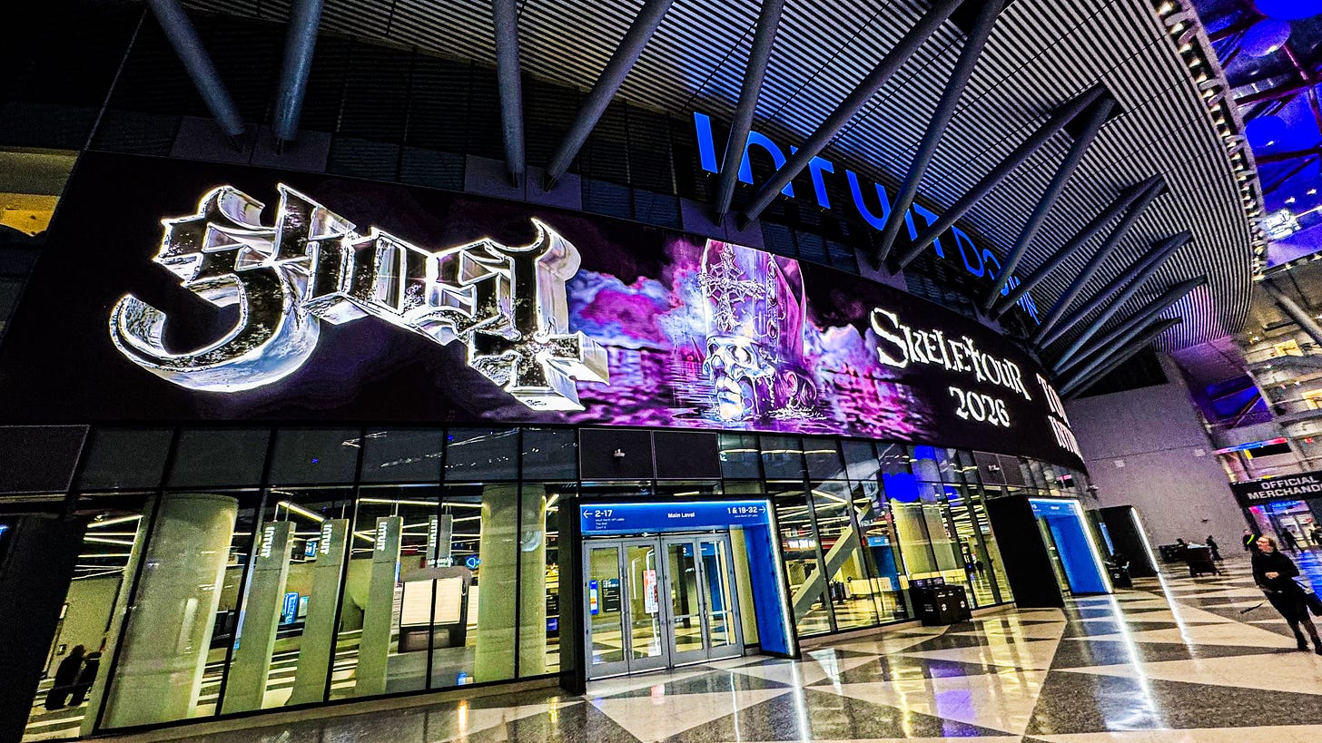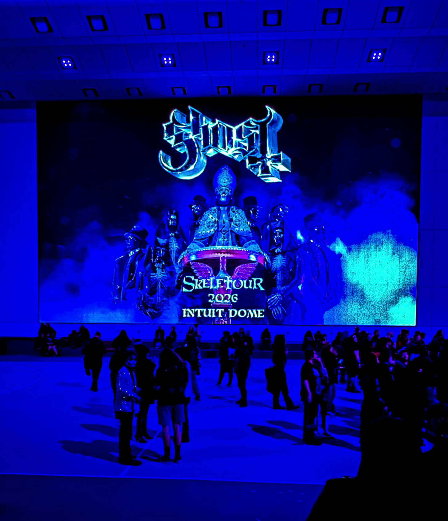 Masuk ke Intuit Dome, gue langsung terdiam. Anjir baru sadar itu venue gede banget. Spanduk Ghost tergantung mengelilingi arena juga gedeeeeee banget.